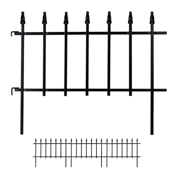 Wymiary: • Panel: ok. 45,5 x 57,5 x 2,5 cm 📏 • Długość całkowita: ok. 226 cm 📏 • Wysokość bez nóżek: ok. 31 cm 📏 • Waga panelu: ok. 0,6 kg ⚖️ • Materiał: 100% żelazo 🔩 • Kolor: czarny 🎨 • W zestawie: 4 panele ogrodzenia (bez dekoracji) 📦